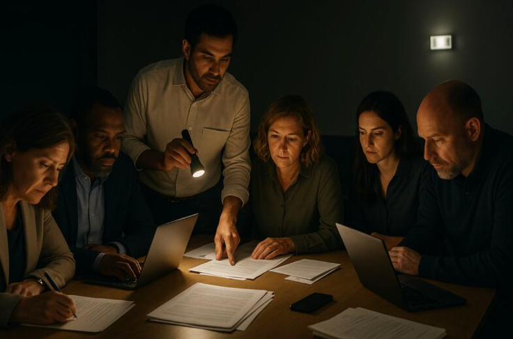 Crisisteam bij stroomuitval (gegenereerd met AI)
